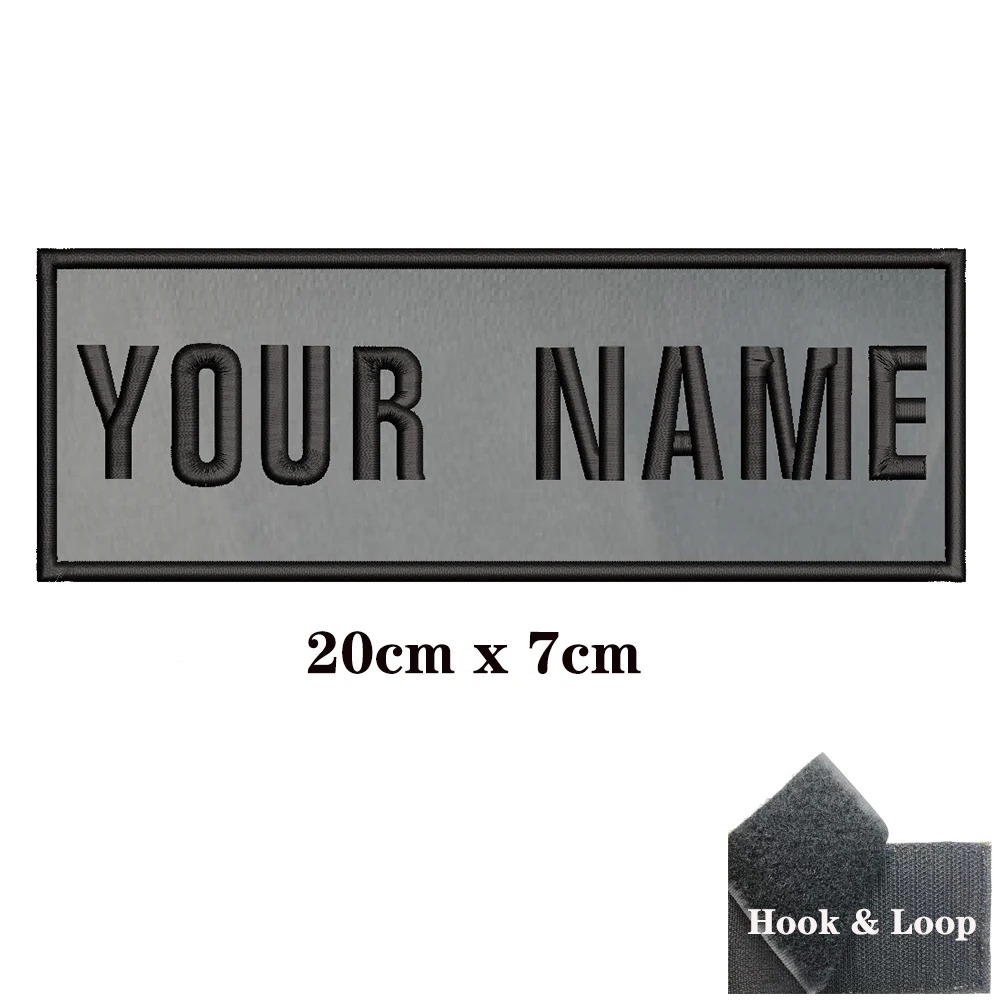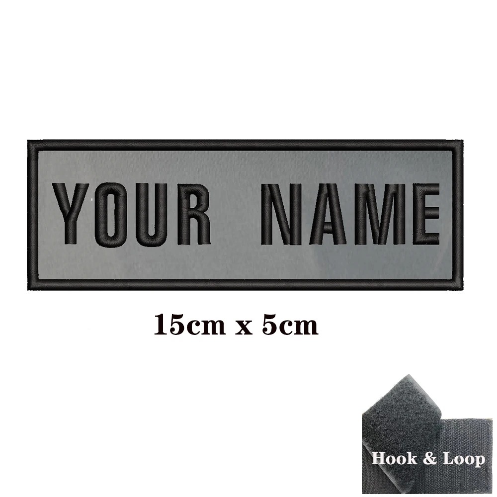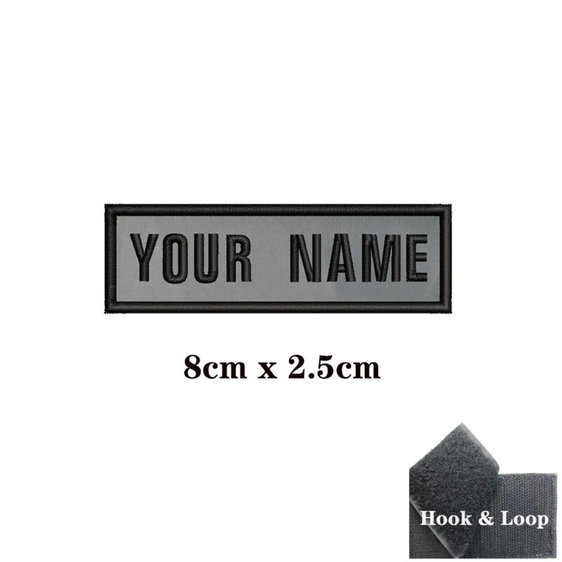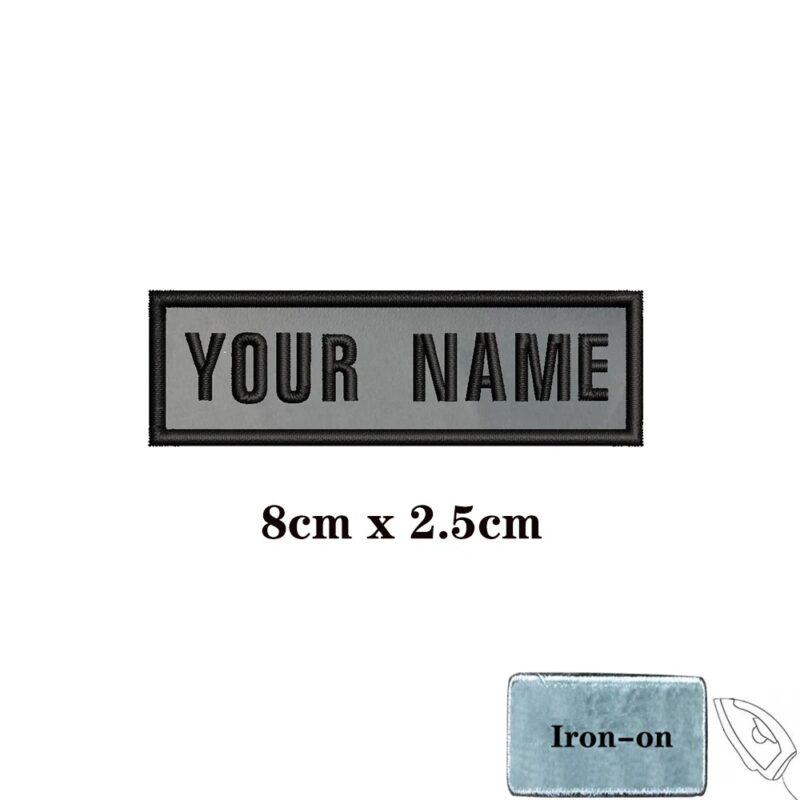 Elevate your attire with our finely crafted embroidered name patches. Perfectly designed to your specifications, our patches boast a classic gray background paired with a defining straight-edged black border. Each custom name patch stands out with its bold black text, but if black isn’t your color, feel free to customize! From uniforms to casual wear, these name patches add a touch of personalized elegance.