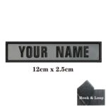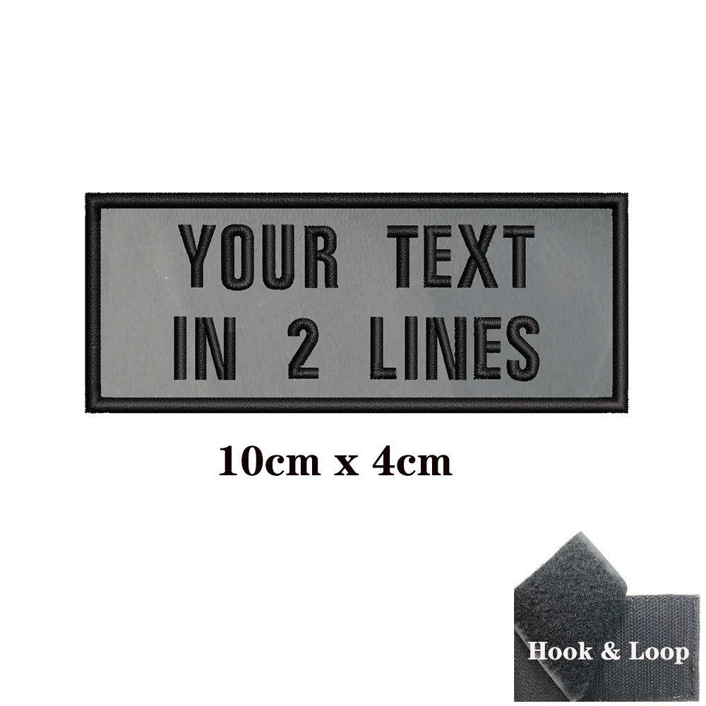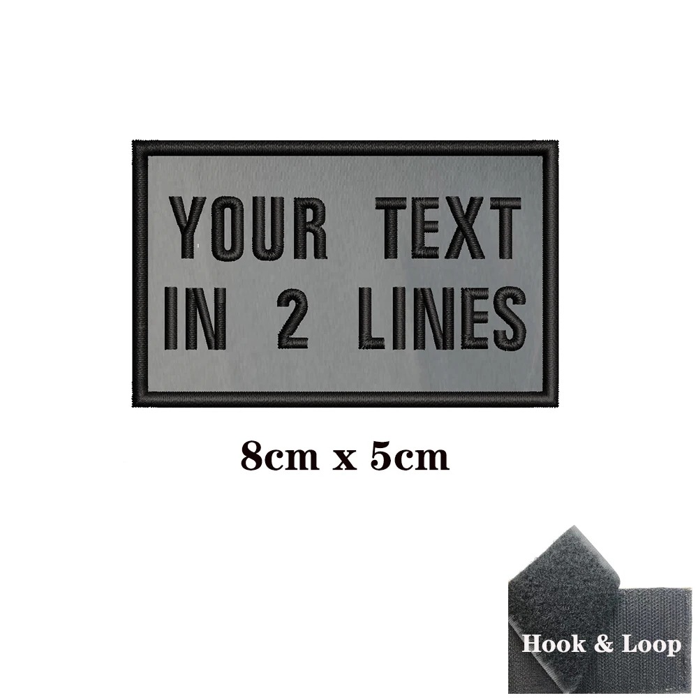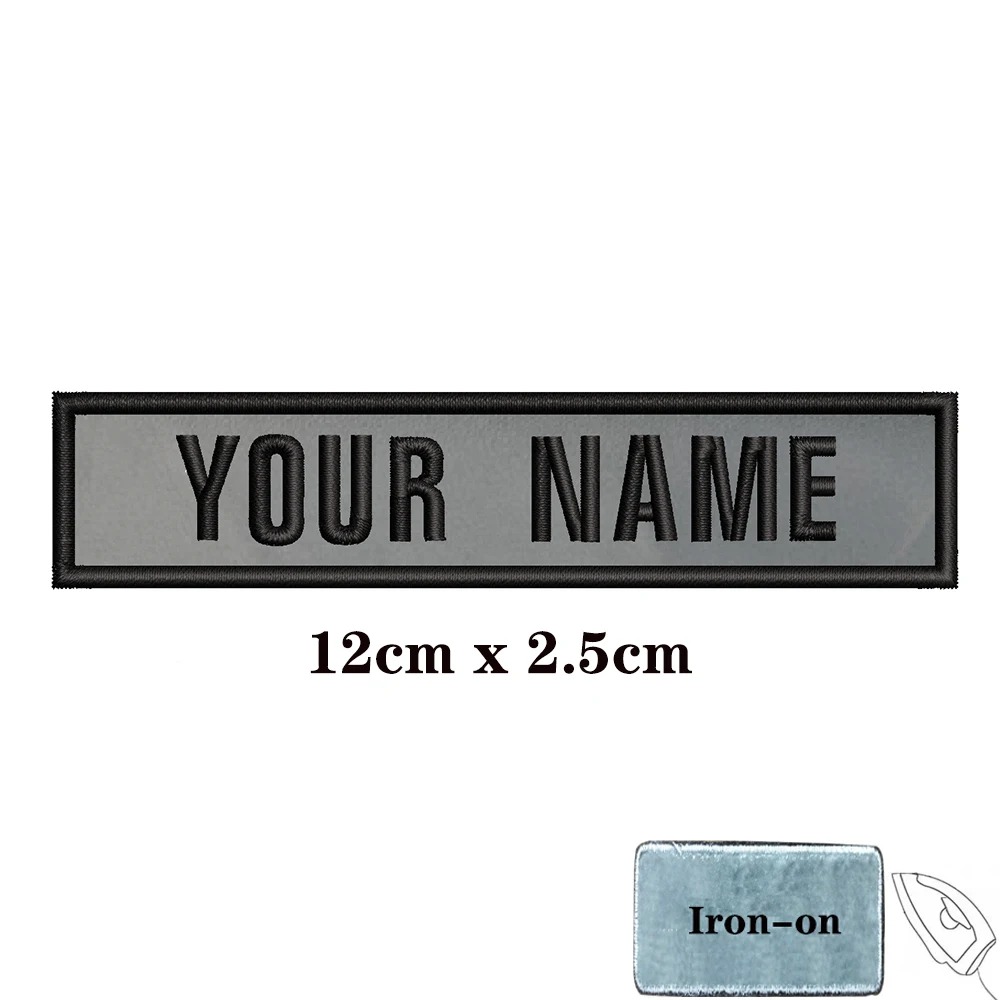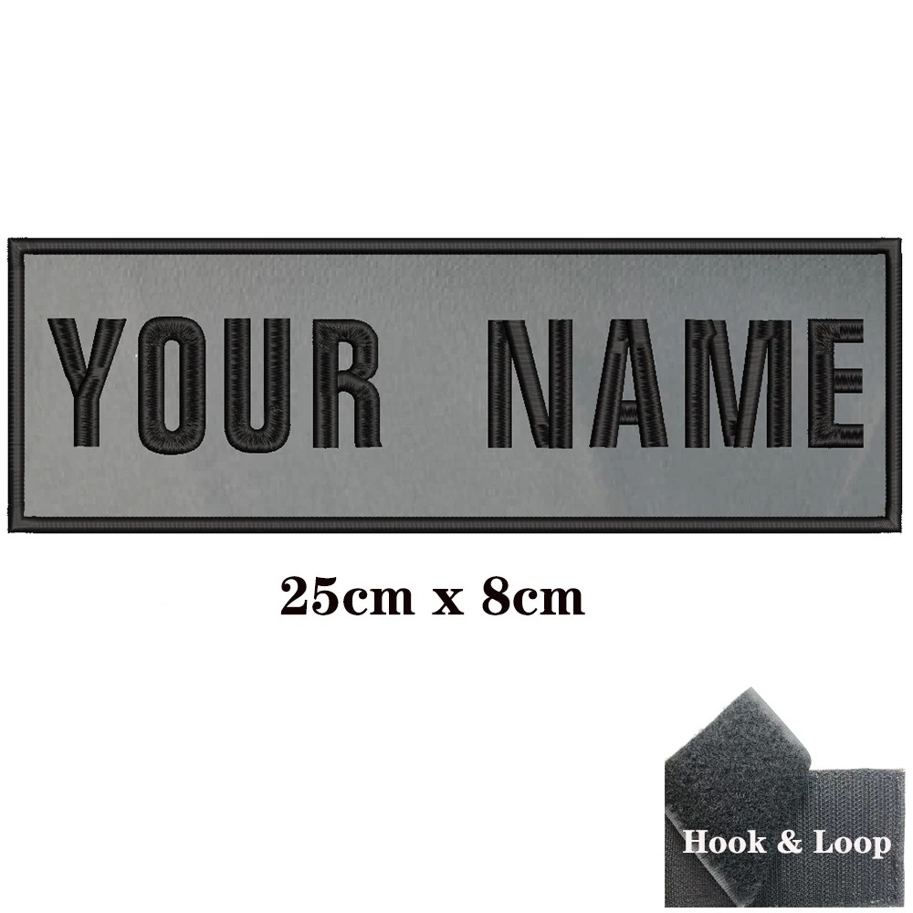 Elevate your attire with our finely crafted embroidered name patches. Perfectly designed to your specifications, our patches boast a classic gray background paired with a defining straight-edged black border. Each custom name patch stands out with its bold black text, but if black isn’t your color, feel free to customize! From uniforms to casual wear, these name patches add a touch of personalized elegance.